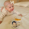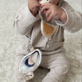 Meet our curious little oyster — holding tight to what matters most. With soft textures, a rattle tucked inside, and sensory beads that invite tiny hands to explore, this pacifier charm is more than a toy — it’s a small symbol of comfort and courage. Clip it to your little one’s outfit and let it stay close through every nap, wobble, and wonder.