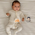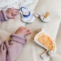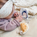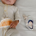 Meet our curious little oyster — holding tight to what matters most. With soft textures, a rattle tucked inside, and sensory beads that invite tiny hands to explore, this pacifier charm is more than a toy — it’s a small symbol of comfort and courage. Clip it to your little one’s outfit and let it stay close through every nap, wobble, and wonder.